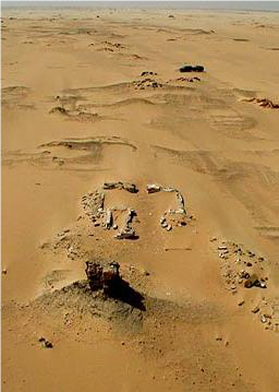 there are traces of mudbrick walls, vaults and lintels visible in the sand both