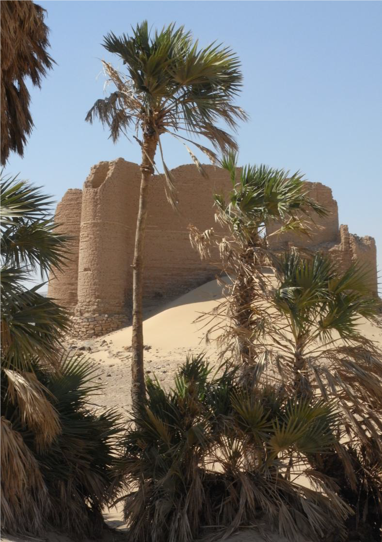 Qasr al-Labekha is one of the most spectacular forts and temples in Kharga andone of the largest settlements in the Kharga oasis in the Roman period.It was in use from at least the Ptolemaic period until the 4th century AD. The large fortress housed a garrison and guarded the Darb Ain Amur, the main route to Dakhla. The mudbrick fortress has door posts and a lintel of limestone and each corner is fortified by a round tower. Some of the walls are still preserved to a height of 12 meters (38 foot). The interior is filled with sand, but it is accessible by a door in the eastern wall. The site also contains two temples, aqueducts, remains of the settlement and a necropolis. To the north of the fortress is a mudbrick temple from the 3rd century AD. Inside is a great hall leading to an antechamber and a sanctuary in the western end. The doorway between the hall and the antechamber still has a cornice painted in red, blue, green and black. Today a few traces of decoration remains, but during clearance of the temple a number of limestone fragments inscribed with the title Caesarand referring to Amun were found. There is an altar in the western part of the hall and a gate outside the temple leads to an underground chamber. A staircase may have given access to the roof. About 250 m to the south is a rock sanctuary that may have originally been the tomb of a local man called Piyiris who was deified after his death. The tomb consists of two pits with two connected antechambers. Another sanctuary is partly hewn out of the rock and partly constructed of mudbrick, and also preceded by two halls. In the necropolis west of the fortress are tombs from the Ptolemaic and Roman periods. They contained wooden statues, jewellery, amulets and fragments of funerary masks (CISS Inventory 2010; Vivian, 1990).