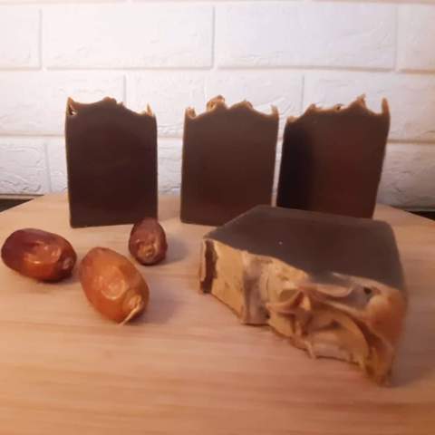 Natural body date soap made of virgin olive oil, virgin Coconut Oil, palm oil, date honey, dates kernel coffee and essential perfume oil.