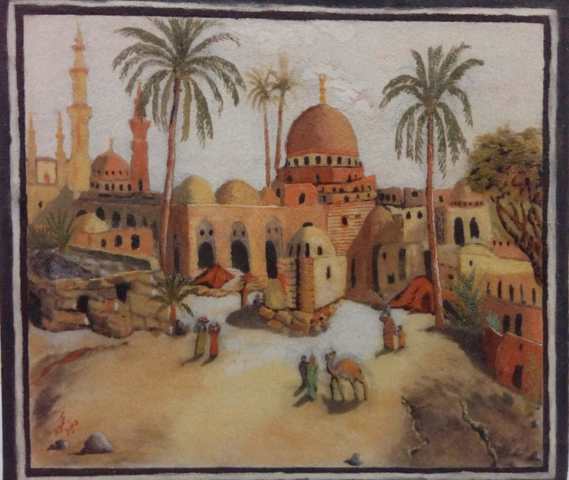 Handmade wooden painting drawn with natural colored sand, symbolizing the Islamic era
