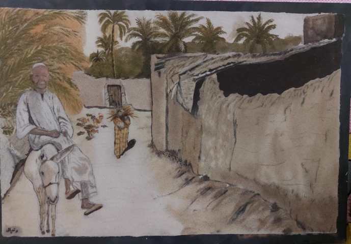 Handmade wooden painting drawn with natural colored sand, symbolizing a farmer riding a donkey going to his farm from the village