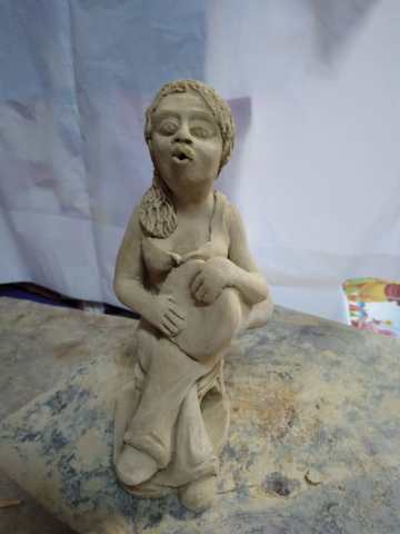 Handmade statue symbolizing a woman plays the drum ( it is at raw stage of preparation )