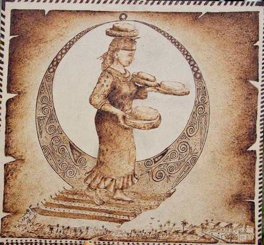 Handmade wooden painting drawn with the fire feather technique (burning), symbolizing a girl carries bread