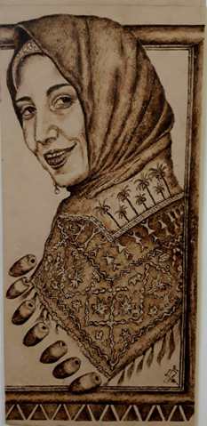 Wooden drawing using the fire feather technique (burning), symbolizing a girl from the oasis