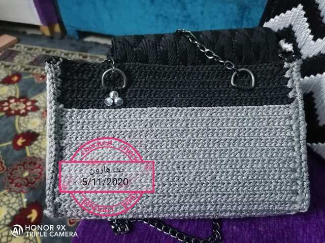 Handmade bag made of plastic net, chain string, and metal chain hand