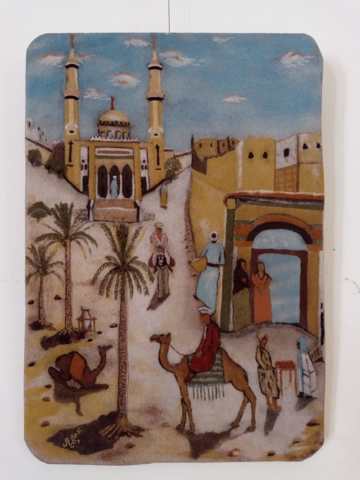 Handmade wooden painting drawn with natural colored sand, symbolizing the Islamic era