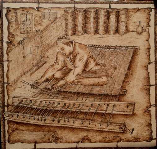 Wooden drawing using the fire feather technique (burning), symbolizing the mats maker