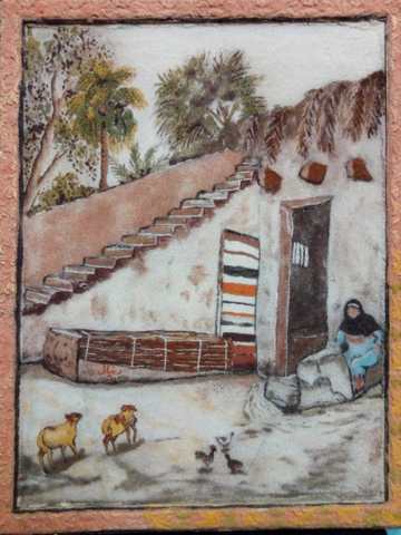 Handmade wooden painting drawn with natural colored sand, symbolizing the ancient oasis houses