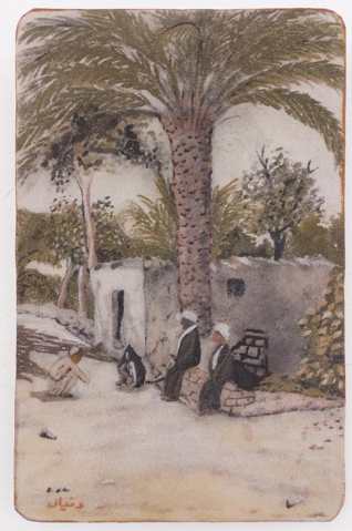 Handmade wooden painting drawn with natural colored sand, symbolizing the people of the village gathered in the shade of the palm trees