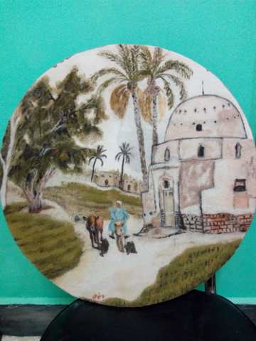 Handmade wooden painting drawn with natural colored sand, symbolizing a tomb of a shiekh