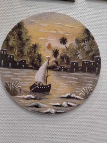Handmade painting drawn with natural colored sand, symbolizing the sunset in the Nile