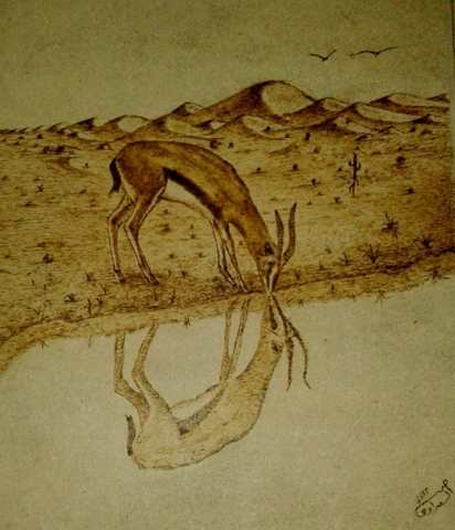 Handmade wooden drawn with the fire feather technique (burning), symbolizing the thirst of freedom in the desert